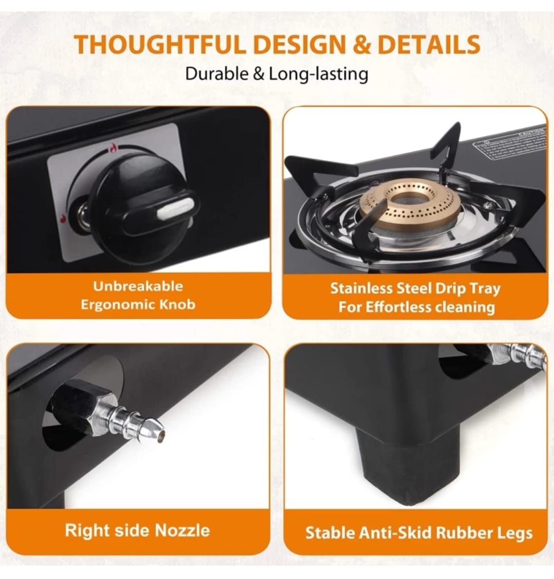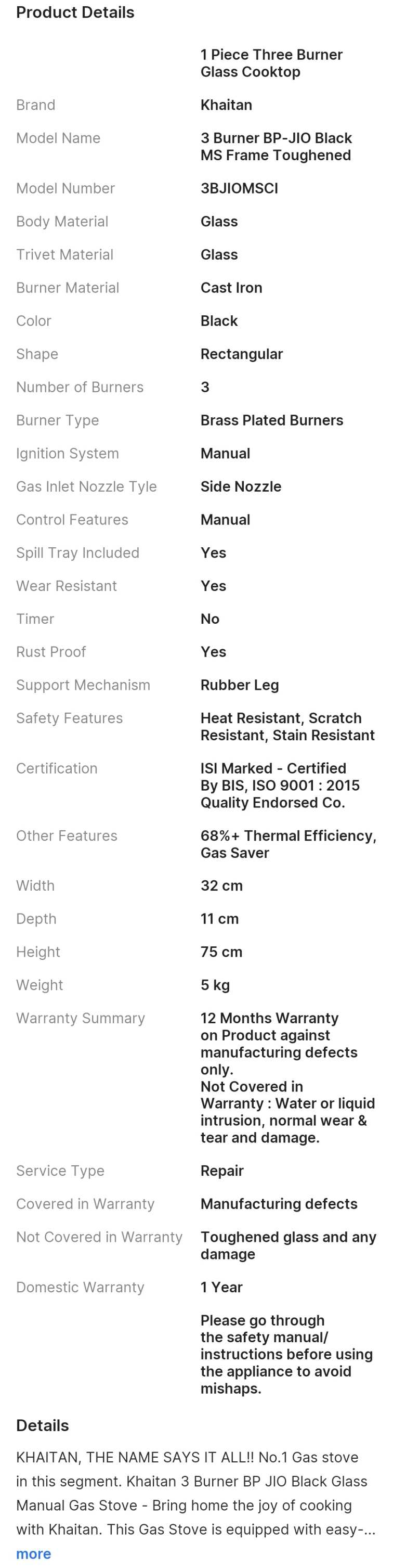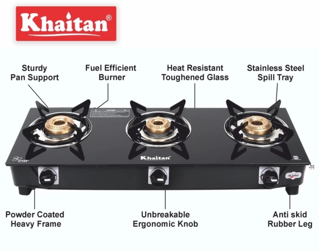 Khaitan 3 Burner BP-JIO Black MS Frame Toughened Glass Manual Gas Stove (3 Burners)